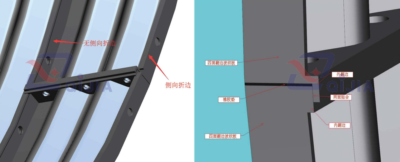 根据隧道或涵洞的截面,可定制出相应的波纹钢结构。波纹板两端部带L型翻边法兰,波纹板的两侧边上设有用于定位相邻波纹板上折弯边的限位边,通过在波纹钢结构与原有隧道或涵洞之间填充注浆材料,使两者可以作为一个整体受力结构,大大提高其承载能力和抗震性能,延长使用寿命。