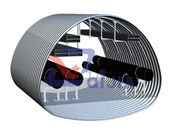 除去我们常见的钢筋混凝土结构,钢波纹管涵结构同样可以作为综合管廊的主体结构。其主要利用波纹管涵的承载能力大、抗腐蚀氧化能力强、空间可塑性强、后期支护结构安装方便的特点,同时波纹管涵防火,密封性能好,表面处理方便,与防护材料简单方便配合可实现防静电能力。