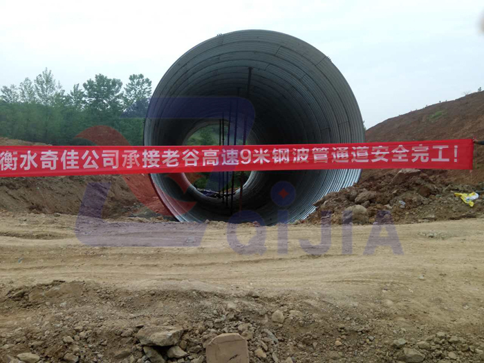 奇佳公司生产及安装与一体的老谷高速直径9米钢波纹管近日已顺利完工,这也是目前在高速公路基础建设中直径最大的钢波纹管,在同行业中更是首屈一指。经全体员工共同努力,在整个施工过程中,从进场沟槽开挖到安装回填均有条不紊地进行,我公司严格按照施工设计及甲方要求,有计划地进行,工程保质、保量顺利竣工。