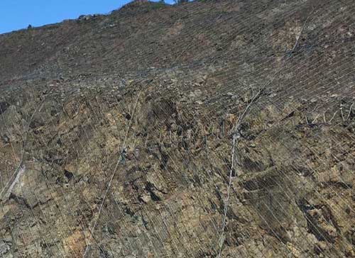 纵横交错的ф 16横向支撑绳和ф 12纵向支撑绳与4.5*4.5米正方形模式(边沿局部根据需要有时为4.5*2.5m)网格内铺设一张DO/08/300/4*4(或4*2m)型钢丝绳网,每张钢丝绳网与四周支撑绳间用缝合绳联结并拉紧,该预张拉工艺能使系统对坡面施以一定的法向预紧压力,从而提高表层岩土体的稳定性,尽可能地阻止崩塌落石的发生并将小部分落石限制在一定的空间内运动,同时,在钢绳网下铺设小网孔的SO/2.2/50型格栅网,以阻止小尺寸岩块的塌落。公司核心业务主要包括:用以保护边坡及山体防止山体滑坡的防护网(主动防护网、被动防护网)