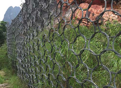 边坡防护网(ROCCO环形网)采用热镀锌工艺,在落石冲击过程中能发生自身几何形态改变、具有更为突出柔性特征的ROCCO环形网来取代钢丝绳网,以此为基础的拦石网能够实现3000kJ以上的落石阻拦,并能进一步简化结构形式(如支撑绳和减压环的配置)、方便局部受损后的维护修复,ROCCO环形网已经成为一种替代钢丝绳网系统的新型拦石网(RXI型),实现了SNS被动防护系统的更新换代和升级。