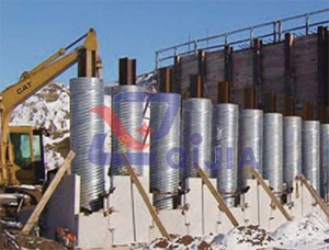 外层防护波纹板上设有横向法兰和环向法兰且均为外法兰结构,环向法兰采用对接方式,横向连接采用搭接方式。安装完成外层防护波纹板后,浇筑混凝土其他填充材料,最后在板片外层喷涂二次防腐材料或警示标识。