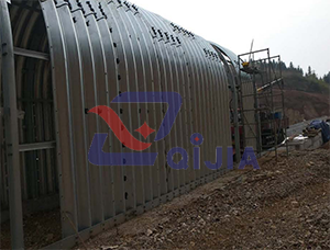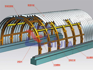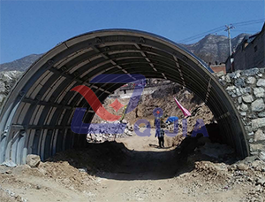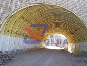 用型钢配合波纹板结构共同使用,以刚性和弹性结构相结合,使拱形结构能够适用超高填土,超低填土大动载荷的情况,此结构能够承受大载荷,冲击力震动力对结构的破坏,可以用于隧道早期支护、桥涵置换抢修、隧道置换抢修、隧道出入口维护、厚积雪防护、重型中小桥涵等环境条件下。