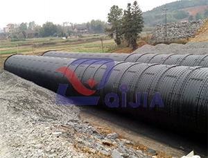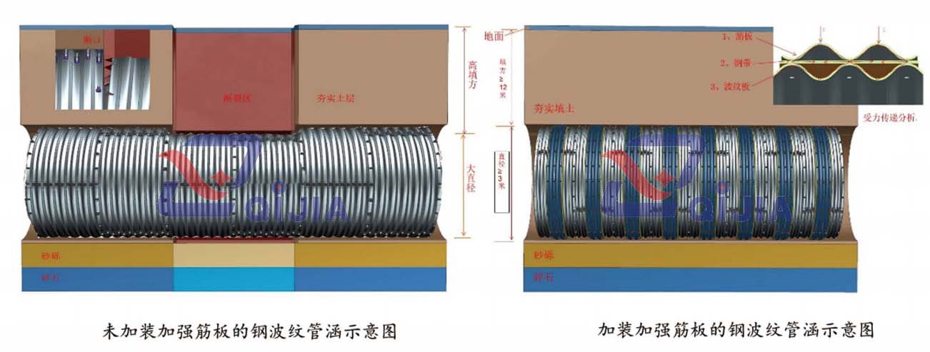 高强型钢波纹管涵可以借助自身特殊结构特性用相对普通钢波纹管涵更小的钢板厚度达到相同的承载力,钢板整体厚度可降低最大20%显著降低管涵总体造价,特别适合用于高填土工程;当钢波纹管涵遇到倾斜度较大时,此种管涵可以保证管体的波纹形状不发生改变,以确保管涵的支撑作用,此种产品可以适用0-20.6度夹角的倾斜环境。